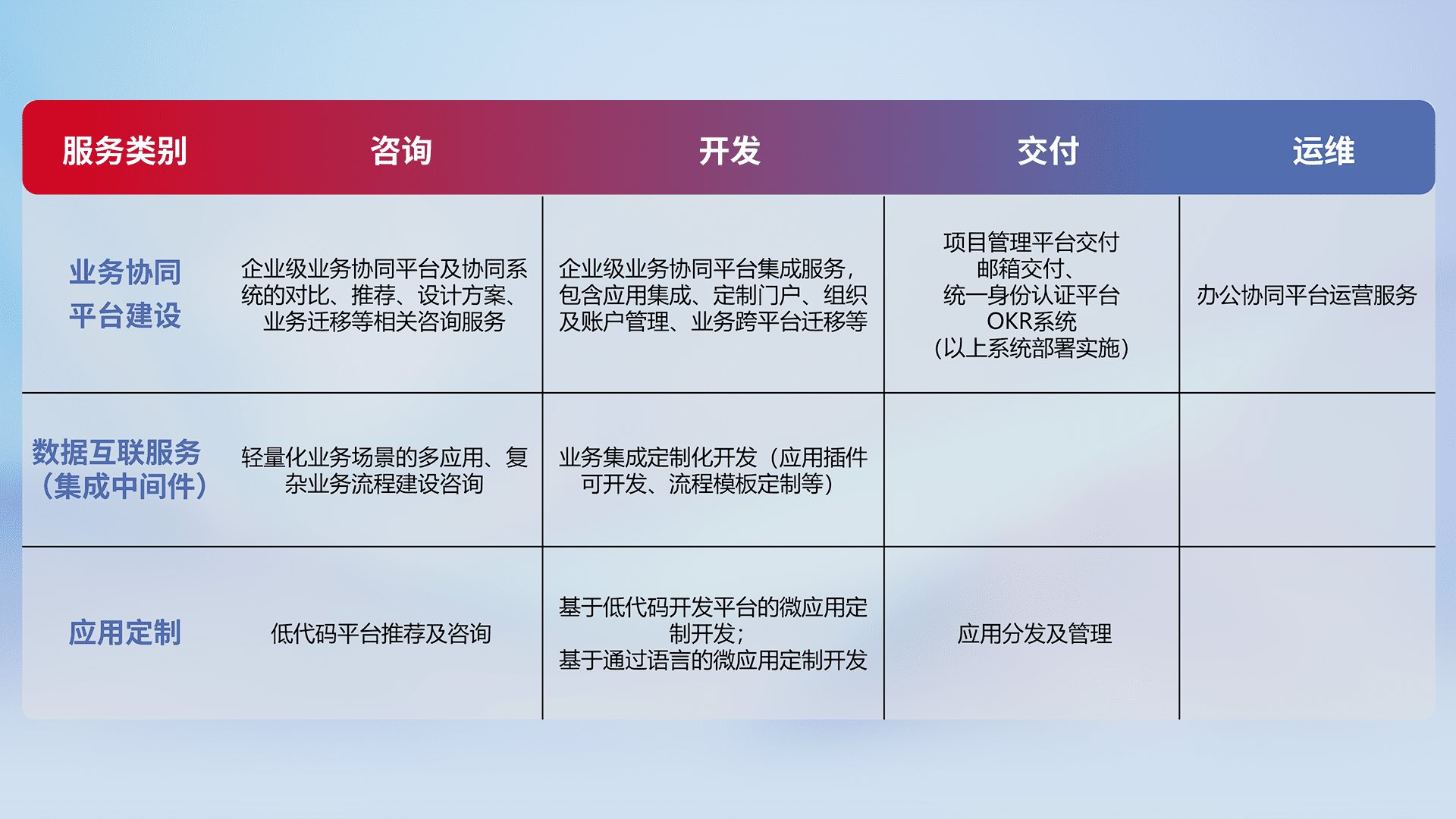 针对钉钉、、企微、、、IDaas等平台级产品提供产品的规划、、、、方案、、、交付、、、定制化开发等服务,,,实现如统一协同办公、、、、智能客户服务、、、混合会议管理、、智能数据查询、、等业务场景,,实现数字化转型。。。。
