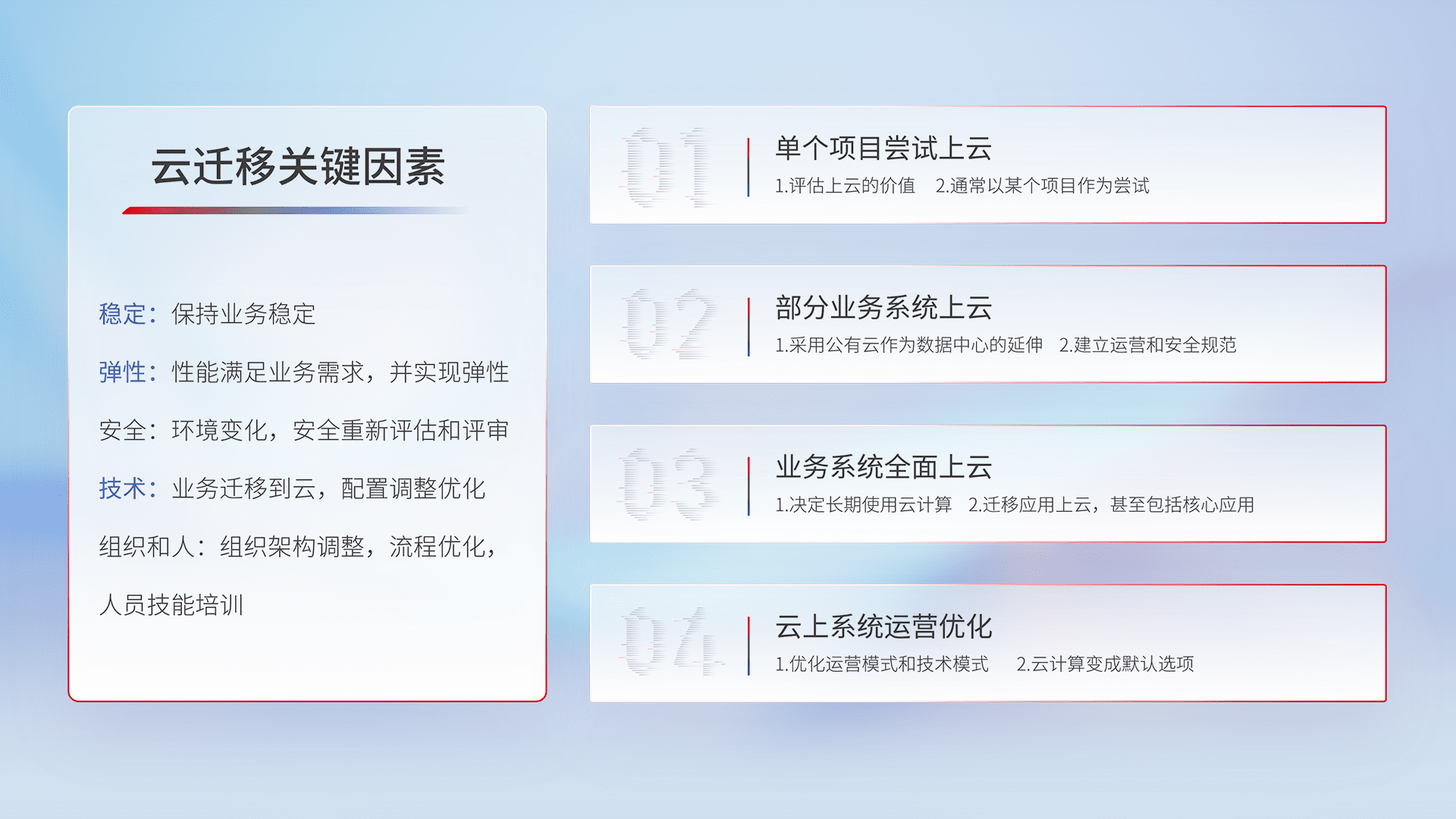 结合实际业务,,从规划设计、、云平台选型、、云原生改造、、、、数据迁移、、、、集成交付,,,迁移全过程为客户识别最佳上云路径,,,,做好风险识别管理,,,设计网络架构、、、身份权限、、、、安全审计合规、、操作审计、、、日志审计、、、、监控告警策略、、多站点容灾设计等,,对云上基础设施进行整体规划,,,提升IT治理水平,,,以满足弹性、、、高可用、、高性能的需求。。。。